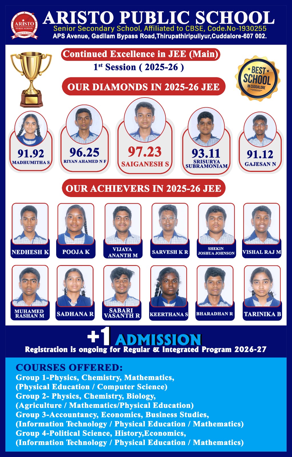 | 2016-2017 | V. Dhanvarshini T.Gnana Soundarya T. Jerusha Esther S. Padma Priya A. Sridevi B. Sridevi G.K. Baranidharan N.Karthick B.Monish K.Narendira Prasath M.Naveen Ambarish D.Vishnu Vardhan S.R. Sri Suraj |
